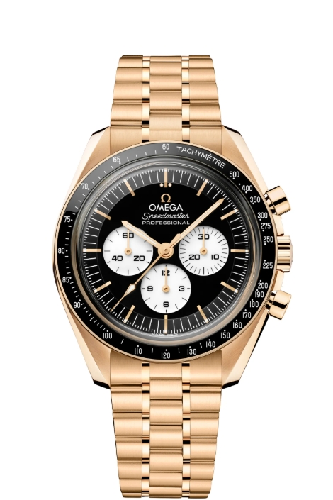 he newest additions to the extended Speedmaster universe are two 42mm Speedmaster Moonwatches, one in steel and the other in 18-karat Moonshine Gold (perfect clone Omega watches’ proprietary yellow gold alloy), each with the distinctive combination of white counters against a black dial and bezel.